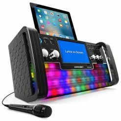 R Exclusive, only available at Toys R Us Canada. Become the star of your next Karaoke party with the iKARAOKE KS780-BT Karaoke System. This unit has all of the features needed to sing and share your performance with your family and friends. The top loading CD/CD&G player plays your favorite music and Karaoke CD&G’s, and when connected to your TV with the supplied cables, you can sing along to the lyrics displayed on your TV screen. The KS780-BT has a big 7″ Color Screen that will display the lyrics for you when using a Karaoke CD&G. When you prefer to use the KS780-BT as a Bluetooth speaker, just connect your Bluetooth enabled smartphone or tablet, drop them in the supplied cradle and get the party started. If your favorite music happens to be on a USB travel drive, we got you covered. Just plug your travel drive into the USB port and play your favorite MP3/MP3&G music. The USB port can also be used to record your karaoke performance, so you can share with your family and friends. The multi color lighting effect will add the ambiance as it pulsates to the beat of the music. The KS780-BT includes a wired microphone, cradle, RCA cord for connection to your TV, Demo CD&G and AC Power Cord.