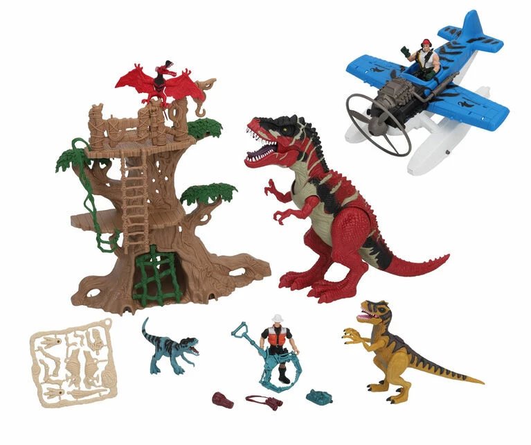 Includes: giant t-rex, tree house with vines, ladder and gate, airplane, 2 figures, 2 smaller dinos, pterodactyl, fossils bones, and accessories