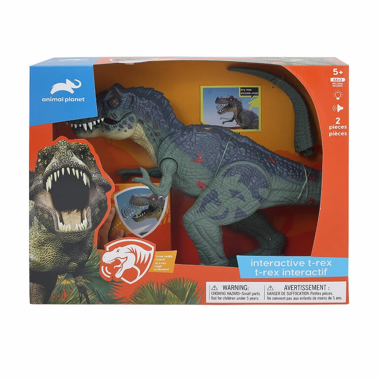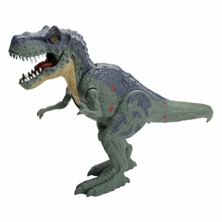 He growls, he roars, he stomps and snarls! Just touch his belly, back or tail, and he comes to life ready to stalk his prey. The mighty tyrannosaurus rex was the tyrant lizard king of the prehistoric world. Reaching almost 40 feet in length and weighing in at up to eight tons, he could seize his prey in his small but mighty arms with ease. Looks like he sees lunch! Roarrrrrr!