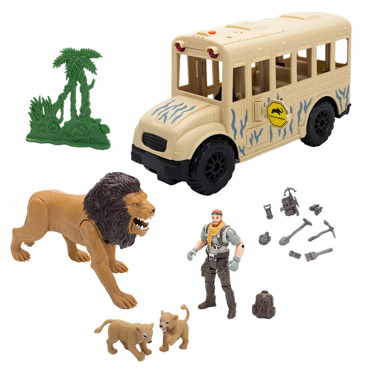 The jungle can be a brutal place, where even a magnificent lion and its cubs can be injures! Fearless adventurer is sent into the deepest wild to rescue the wildcats. Press the lion’s head to make its jaws snap. Swing the truck doors open – adventurer fits inside. Press the button on the freewheeling truck for lights and sounds and roll it to the rescue. Give the felines the royal treatment that kings and queens of the jungle deserve!