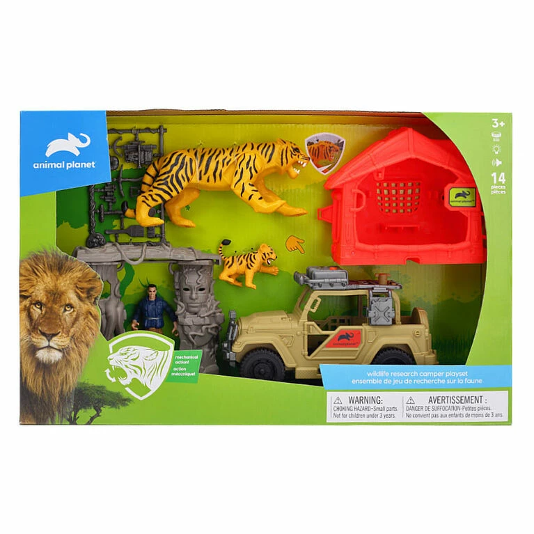 There’s a lot to learn out in the wild. You can help the researcher discover the habits and attributes of the tiger and its cub. Press the button to see the tiger jaw chomp! Attach the camper to the top of the four-wheel jungle rover vehicle and press the button for light and sounds. There is plenty of room to store supplies. walk the researcher down the camper ladder. Explore some more in the ancient jungle ruins. The included researcher action figure fits in the freewheeling vehicle. roll it along to discover more wildlife creatures to study.