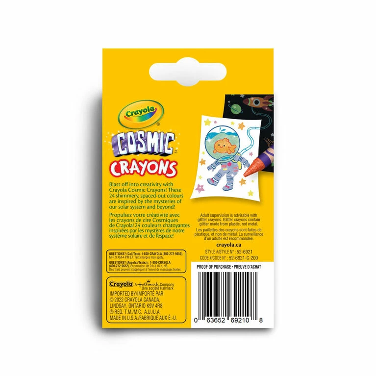 Experience crayons that are out of this world! Inspired by the mysteries of the solar system, Crayola Cosmic Crayons are a 24 count crayon box featuring 12 pearl crayons and 12 glitter/pearl mashup crayons. Kids will love using these shiny, sparkly colours to work on a solar system project for science class, to brighten up homemade cards, and add glittery fun to their colouring and activity books. Safe and nontoxic, these specialty crayons are double-wrapped, so they stand up to repeated use – and kids who are super excited about bringing the wonders of the universe to life! Perfect for kids ages 4 and up.