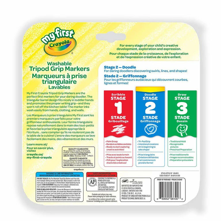 My First Crayola Tripod Grip Markers are perfect for your daring doodler. The triangular barrel is designed to fit nicely in toddler hands and promotes the proper writing grip – and they won’t roll off the kitchen table! With eight different colours, this pack of markers gives your kids plenty of options for colouring or free, imaginative drawing. These markers are fully washable and do not stain clothes, carpet, or skin, so parents can have peace of mind while children get adventurous with colouring.