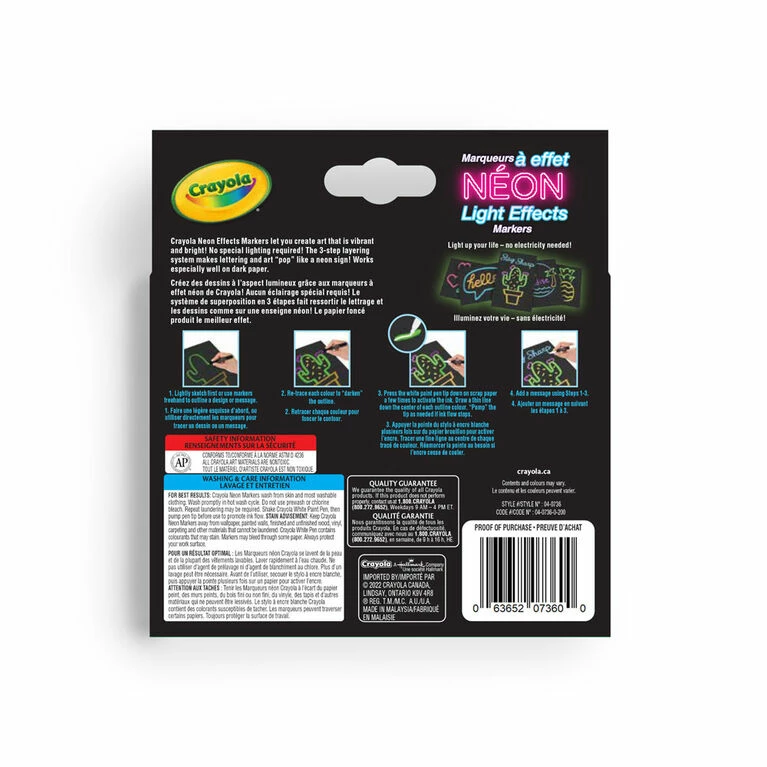 Crayola Neon Effects Markers let you create art that is vibrant and bright like a glowing neon sign! No special lighting is required! Just follow the simple 3-step layering system and watch lettering and art “pop”! Neon Light Effects Markers work well on both light and dark paper, but the effect is especially bright on dark. The set features 6 Broad Line Gel Effects Neon Markers and 1 White Paint Pen and also includes instructions to help artists get started creating with their Crayola Neon Markers right away. Ideal for teens and adult colouring or lettering enthusiasts.