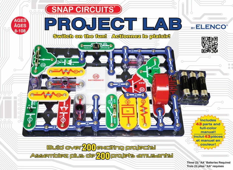 The ultimate Snap Circuits set! Enjoy hours of educational fun while learning about electronics! Just follow the colourful pictures in our manual and build exciting projects such as AM Radios, Burglar alarms, doorbells and much more! Over 200 new/unique projects included in the easy to follow manual. You can even play electronic games with your friends. All parts are mounted on plastic grids and snap together with ease. No tools required.