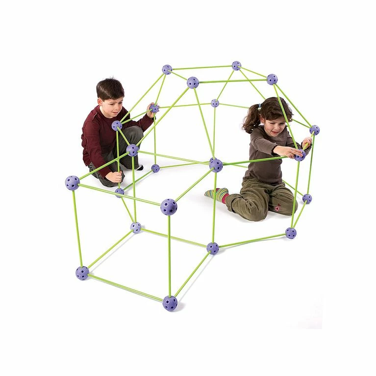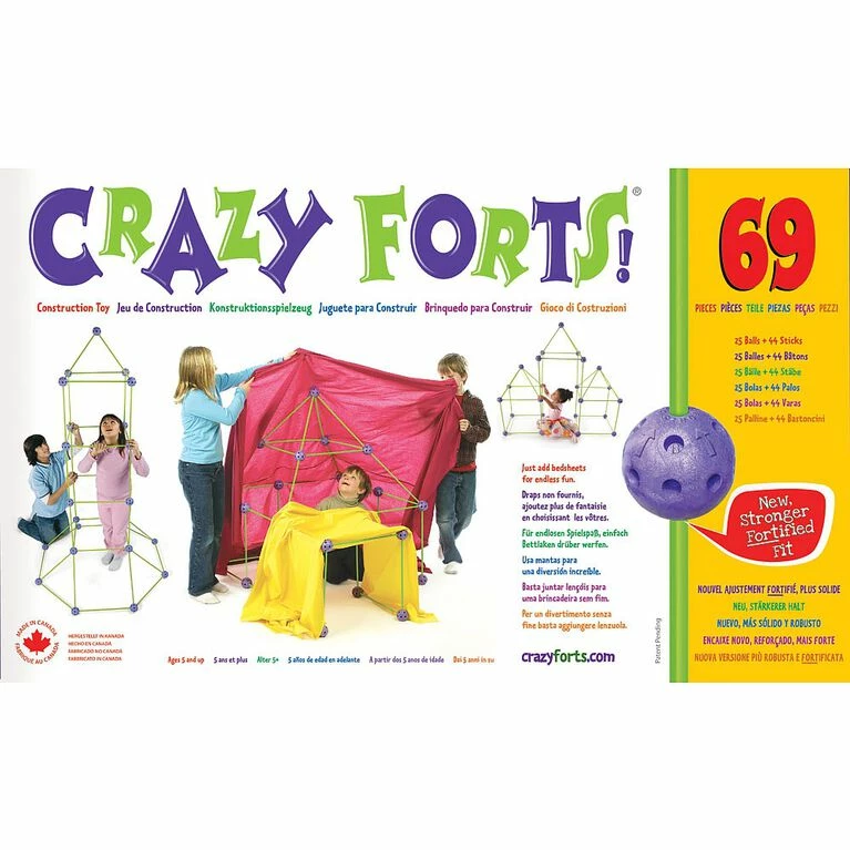 Crazy Forts are a unique, award winning, building and creative toy. Crazy Forts come with 69 child-safe toggles and rods that join together to build any play space from your child’s imagination. Create a “Cave” one day, an “Igloo”, “Pirate Ship” or “Castle” the next … put the pieces together in different configurations, cover with bed sheets and “voila!” kids have a unique new play space every time! Crazy Fort is powered by a child’s imagination. Each Crazy Fort Kit contains 25 geometrically precise balls and 44 sticks that connect to create a multitude of possible play structures.
