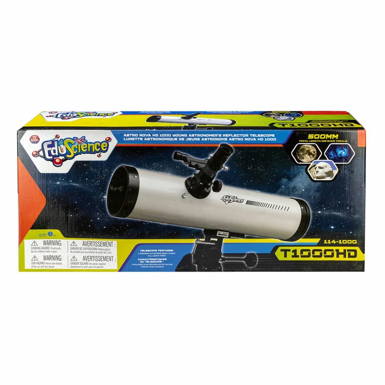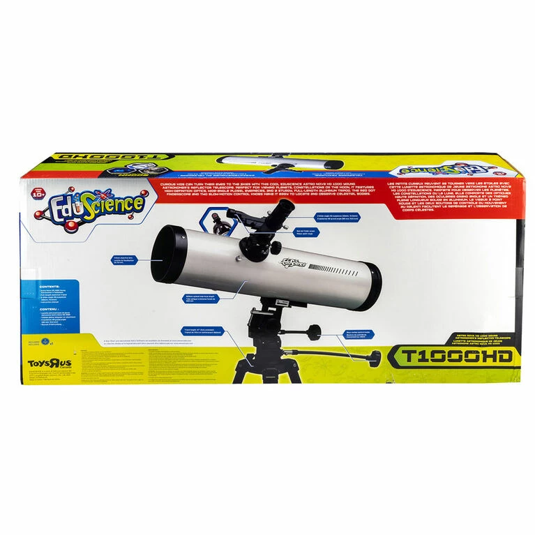 Toys”R”Us Canada Exclusive – Edu Science – Astro Nova HD 1000 Young Astronomer’s Refractor Telescope Newtonian Astronomical Telescope is a perfect portal into the realm of deep sky observation. Offering a 114mm aperture and a 500mm focal length, the telescope comes with two eyepieces that produce images with excellent definition and contrast. The set also includes an adjustable tripod, a red dot viewfinder, Downloadable computer software and a star map. Just add clear, dark skies on a moonless night and a red flashlight to protect your night vision and you are set to explore the universe.