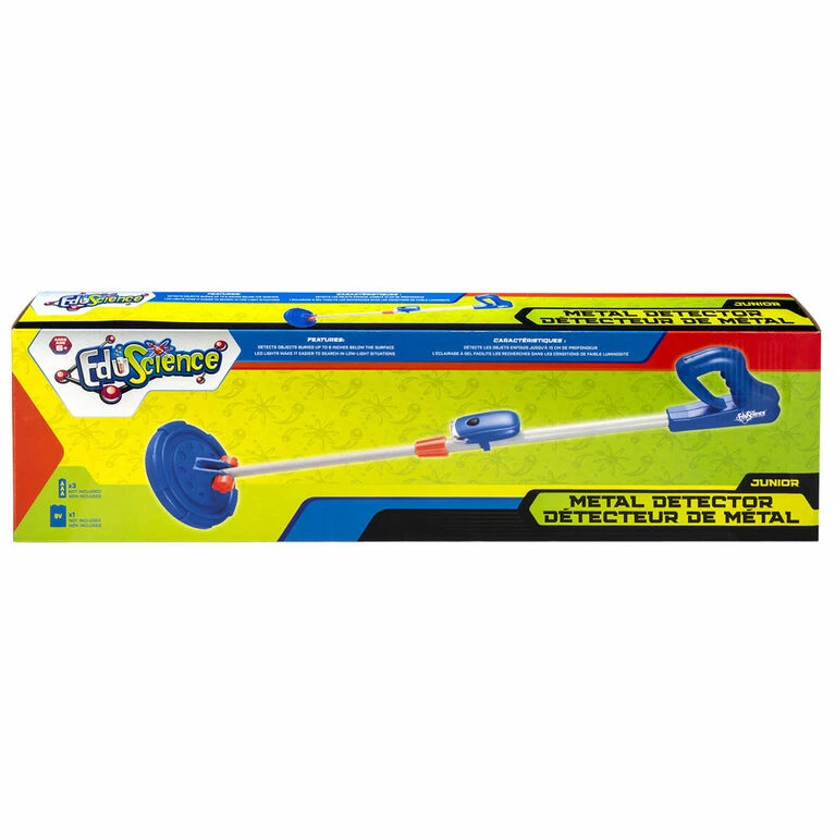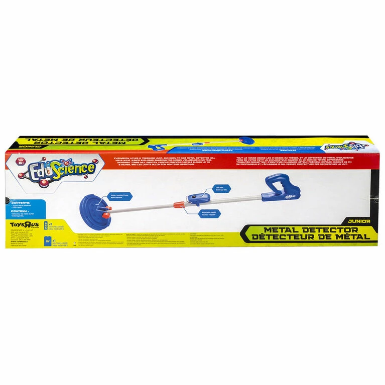 Toys”R”Us Canada Exclusive – Edu Science – Metal detector. Everybody loves a treasure hunt, and the Metal Detector is easy-to-use and will have your junior explorer sweeping for hidden valuables in no time. Different tones will identify various precious metals buried up to 6 inches, and LED lights allow for low light or nighttime searching.