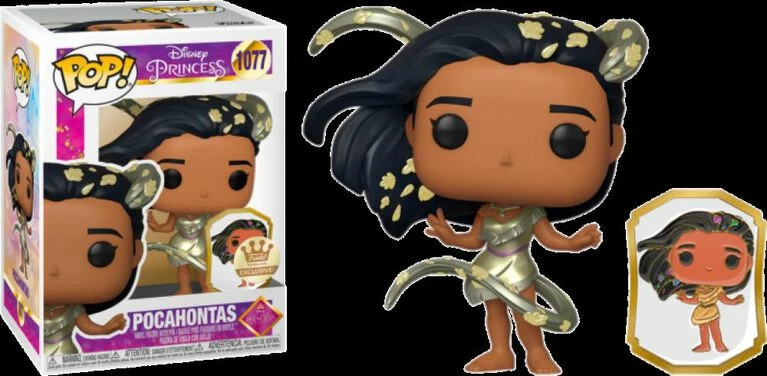 R Exclusive, only available at Toys R Us Canada. Each Ultimate Disney Princess Pop! Vinyl comes with a stunning metallic gold finish, and is accompanied by an exclusive enamel pin. Here we have Pocahontas, looking as regal as ever with her metallic dress.
