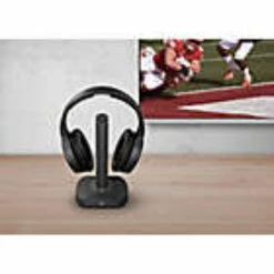 Surround your ears and listen in private with ultra-clear, completely cord-free RF technology. Powerful 40 mm neodymium drivers are perfectly tuned to produce clean, bass, bright mids, and exquisite highs-distortion-free, at any volume. Streamlined and simple receiver doubles as a headphone charging dock and is equipped with standard 3.5mm/RCA inputs as well optical I/O for high quality audio. The comfortable, over-the-ear design completely encloses your ears keeping ambient noise out, so you can focus on what you’re watching, while smooth grain synthetic leather earpads keep you comfy for hours and hours of listening. With a lengthy range of 100 feet, you’ll be able to listen to any TV its paired to, comfortably and clearly. Comes with a sleek charging stand and features 10 hours of play time per charge. ( This device uses RF / Radio Frequency Technology to transmit sound waves, and is NOT a Bluetooth device)