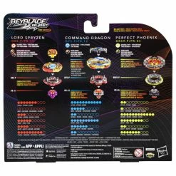 Compete with the elite using the authentic Japanese-inspired Beyblade Burst Pro Series battle system! Beyblade Burst Pro Series tops, launchers, and Evo Elite Champions Beystadium offer authentic components and battle performance features. Legendary mythical beasts are launching into battle! The Mythic Beast Collection includes 3 Beyblade Burst Pro Series competitive battling tops with 3 different performance types: right/left-spin balance-type Lord Spryzen D88-P PR-11, right-spin attack-type Command Dragon D75-P PR-12, and right-spin defense-type Perfect Phoenix DR59-P PR-04. Tops are made with die-cast metal parts for a heavy weight and designed with special top features to unleash in battle. Comes with 3 sticker sheets to customize the tops. Requires Beyblade Burst Pro Series Evo Elite Champions Beystadium (sold separately as part of the Evo Elite Champions Battle Set, subject to availability). Only compatible with Beyblade Burst Pro Series system.