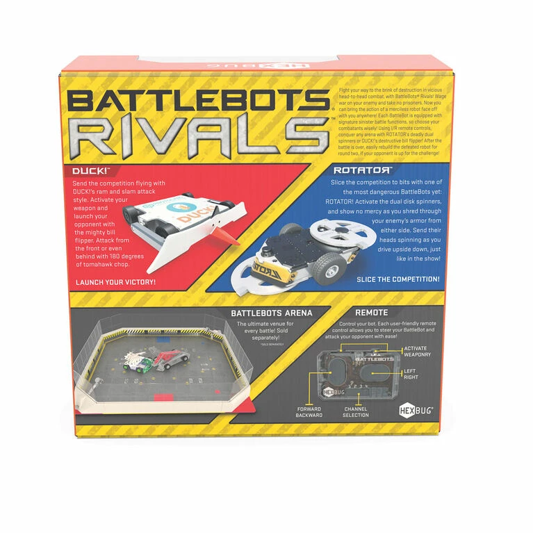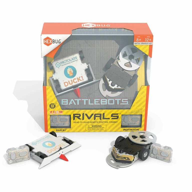 Get ready to do some serious damage! Your competition will never see what’s coming as Rotator’s cunning speed and devastating discs take them down, or DUCK!’s giant lifting arm attacks without mercy! Designed as real life replicas from the popular television series, BattleBots, Rotator and DUCK! have been built for everlasting battle so you can relive all their battle cage glory!