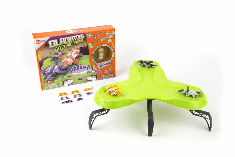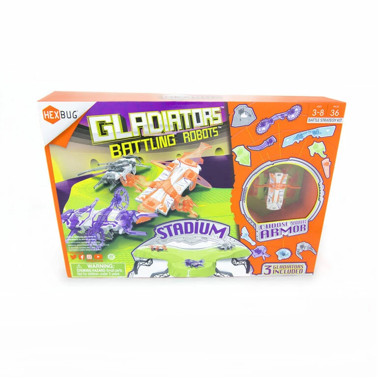 Forged from the world’s mightiest titans comes HEXBUG® Gladiators, combative robots you customize with detachable armor before going into battle. These super charged vibrating robots feature snap-on weaponry so that you can mix-and-match a winning combination of pieces to become the ultimate fighter! Available in eight different character styles, each robot features distinct deco, weapons and armor. Take your battle to new heights with a bigger domain of play, in the Gladiators three sector Stadium. First one to knock the other off the platform reigns victorious, Do you have what it takes?