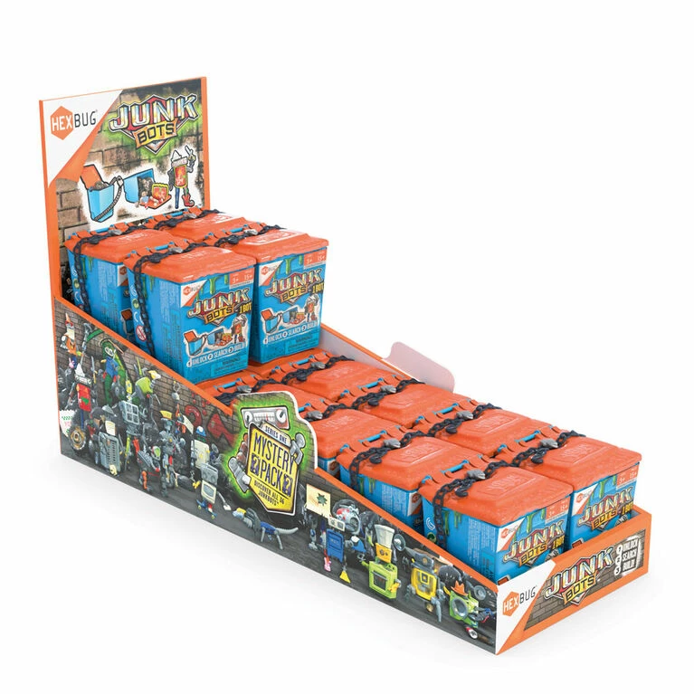 The universal socket system allows you to take apart the Junk Bots and reattach pieces together to create totally unique figures. The more you collect, the more options you have in building your own creation! When your figure is built, the trash-can-packaging doubles as a display stand.