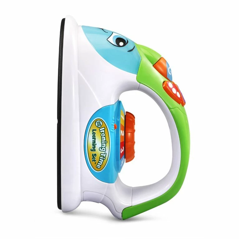Press into learning about shapes, colors and counting with the motion-activated Ironing Time Learning Set! This interactive iron plays songs, silly phrases and sound effects when kids move the iron back and forth. Join the iron in 10+ learning activities! Count to five or sing along to the alphabet song as you iron the included play clothes. Turn the temperature dial to hear about colors, fabrics, and low, medium and high heat. The number one is for low heat, perfect for delicate clothes. Now turn up the heat to watch the light change colors and play steam sound effects! Three buttons show kids numbers, colors and shapes. Press them to hear interactive phrases and questions. Can you find the red shirt? Now iron something with three circles! Watch the iron light up with the color that it names to help kids learn color vocabulary. Hello, yellow! Intended for ages 18+ months. Requires 2 AA batteries. Batteries included for demo purposes only. New batteries recommended for regular use.