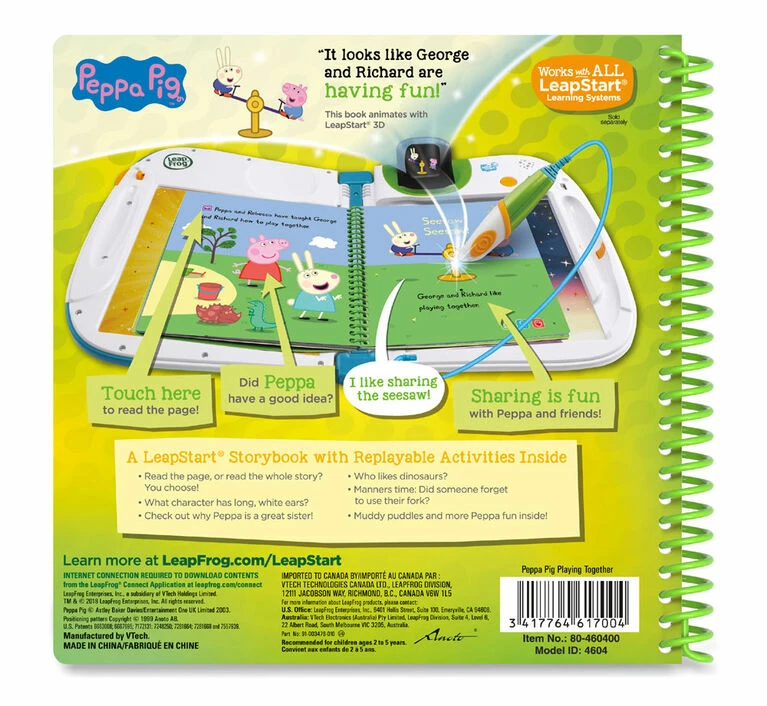 Go on an oinktastic adventure while building reading and vocabulary skills and learning how to share in the Peppa Pig Playing Together storybook for all LeapStart systems. Tap the pictures and words on every page with the stylus to magically bring the story book to life and then enhance the learning with amazing 3D-like animations when played with LeapStart 3D. This book includes reading comprehension activities that let readers predict what happens next, explore the details of the story and then recall what they’ve read when they’re done. The story also teaches important life skills like how to share and play well together. Learn good manners and more through games with Peppa Pig.