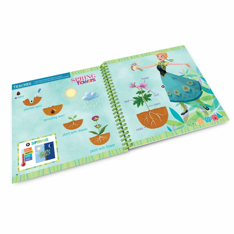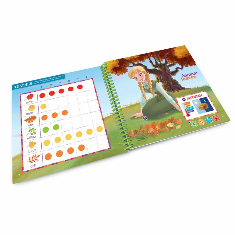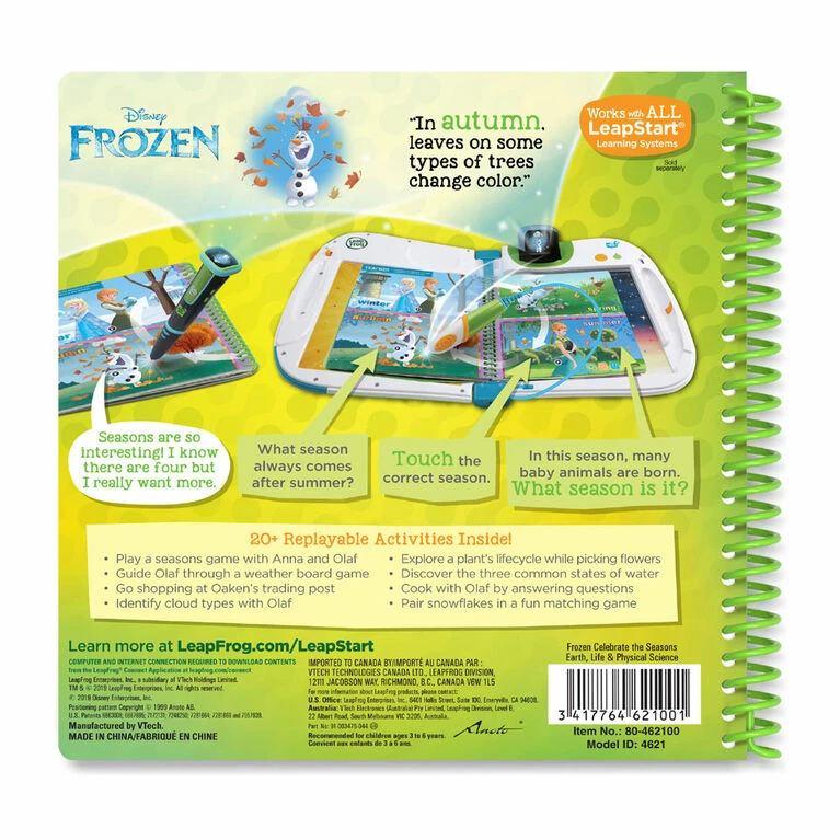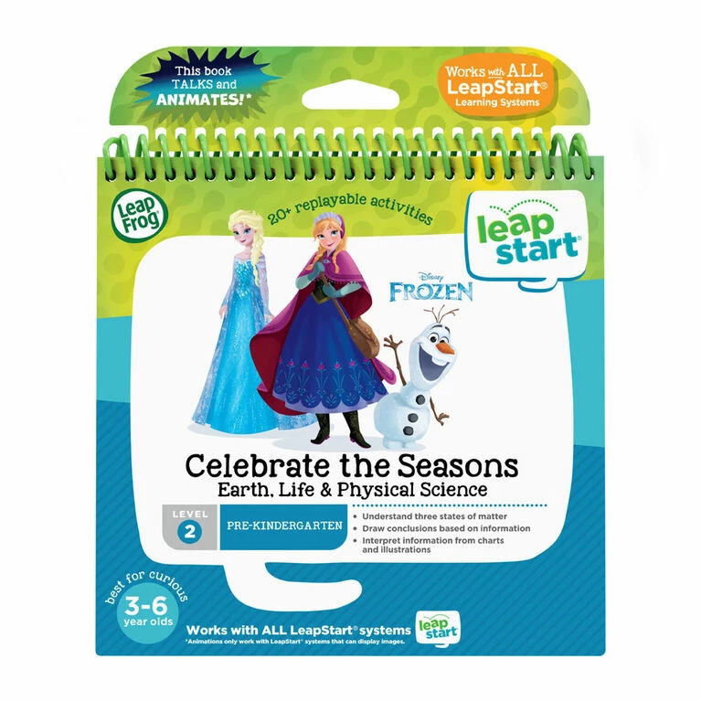 Explore the seasons, weather and a variety of Earth, life and physical science concepts in the Frozen Celebrate the Seasons book for LeapStart systems. Join Anna, Olaf, Elsa, Kristoff and Sven as they explore the world around them. Tap the pictures and words on every page with the stylus to magically bring the activity book to life and then enhance the learning with amazing animations when played on LeapStart systems with a screen. Help Anna and Olaf explore the seasons, see a plant grow from a seed into a plant, play weather games and more. Many activities are designed with two levels so kids can play and learn at the right level and move up when they’re ready. This book is compatible with all LeapStart interactive learning systems. A computer with Internet is required to download books onto the LeapStart system. Intended for ages 3-6 years. Batteries not required.