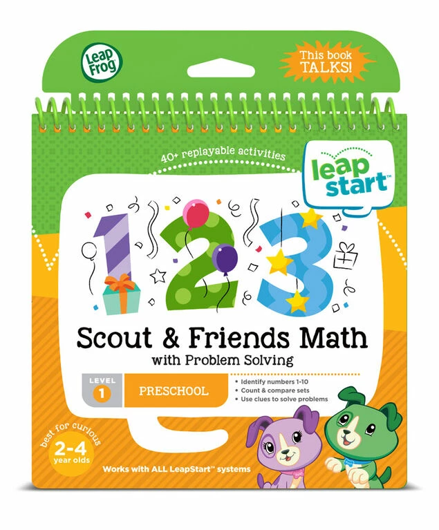 Count on Scout and his pals to show you the fundamentals of beginning math with this fun-filled, interactive activity book for LeapStart-the interactive learning system designed to get your child ready for school and life. LeapFrog LeapStart Scout & Friends Math with Problem Solving Activity Book is jam-packed with 40+ replayable activities that engage kids ages 2-4 at the preschool level to keep them playing and learning for hours. With the LeapStart system, every page talks, sings and jokes with exciting audio interactions that bring learning to life. Join puppy pal Scout and his favorite friends as they play and explore counting, number recognition and problem solving. Count all the butterflies you can find, and then sing along to a cheerful ditty about butterflies. Trace numbers to make sure you have the right ingredients for your recipe, and then “bake” a cake. End the day with a dance party where you can learn numbered dance moves to boogie down.
