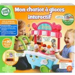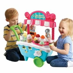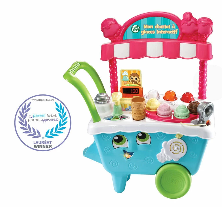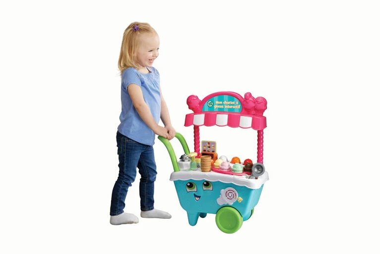 Learning is sweet when pretending to run your own ice cream cart! The Scoop & Learn Ice Cream Cartâ„¢ lets you create a variety of imaginative and tasty-looking ice cream combinations using four flavors of ice cream, three toppings and three syrup flavors. Use the magic scooper to scoop up the ice cream and toppings to build customer orders and it will recognize the colors and flavors. Then press the pump to add pretend syrup while counting to ten. Build memory and sequencing skills by choosing from six cute animal order cards and following the instructions. Ring the bell to let them know their order’s up! Playful phrases introduce colors, numbers, flavors and more while you explore the cart’s features and six activity cards. When you’re ready to move to a new location, place the accessories in the correct places or put them in the two storage drawers and push the cart around to hear upbeat songs and music.
