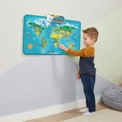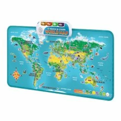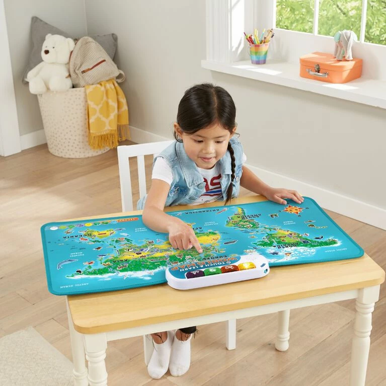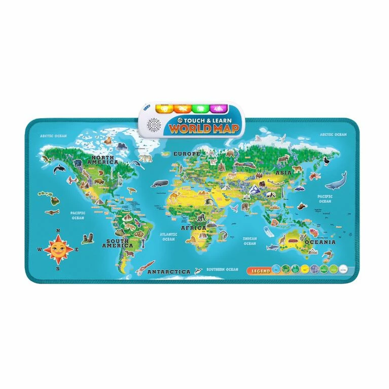 Discover the world’s continents, natural wonders, animals, and more with the Touch and Learn World Map. Hang the illustrated map on the wall and start exploring! 200 interactive touch points invite kiddos to look, touch, press and listen to learn about the world in Explore mode. 1000+ fun facts help kids find out about oceans and continents, natural wonders, countries and languages, animals and habitats, landmarks and more. When you’re ready to test your knowledge, switch to one of the three games. World Racer pits kids against the clock to find each country on the map. In Animal Quest, use clues to find animals around the world. Landmark Expedition encourages kids to search for famous sites all over the map. Bring the world to your children! Keyhole hanger included for easy wall hanging. Intended for ages 4+ years. Requires 2 AA batteries. Batteries included for demo purposes only. New batteries recommended for regular use.