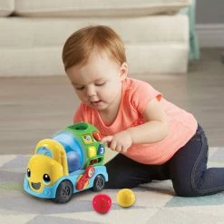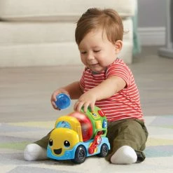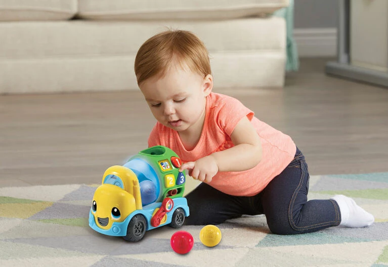 Get to work mixing colors with the Tumble & Learn Color Mixerâ„¢. Drop one of the colorful balls into the adorable construction truck and the mixer will light-up to match the color of the ball. Add another ball and press the lever to watch the balls tumble around and “mix” together to change the color of the mixer and learn how new colors are created. Colorful shape buttons on the side of the truck teach colors, shapes and numbers. Use the buttons to answer questions the truck asks in work mode or add construction sounds to the songs in music mode. Store the balls inside the mixer or open the door to watch them tumble out and play again. It’s color mixing time!