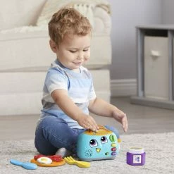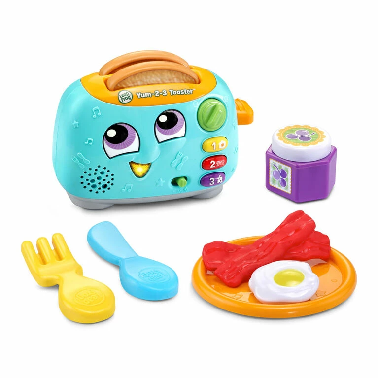 Start the morning with a smile with the Yum-2-3 Toaster! Make friends with this sunny little toaster as you pretend to make breakfast. Put the bread in the toaster and learn about opposites as you choose your toast setting. Ready to count? Press the one, two, three food buttons to learn about numbers, colors, food names and recipes. Nine pretend play pieces include two slices of bread, a jelly jar and lid, a fried egg and bacon, all served up on a plate with a knife and fork. The delightful pop-up action of the toaster engages children with music and learning content. Serve up breakfast with a side of learning! Intended for ages 12+ months. Requires 2 AAA batteries. Batteries included for demo purposes only. New batteries recommended for regular use.