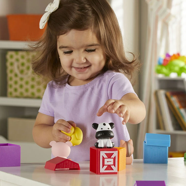 There’s more than hay inside these barns-there’s farmyard learning fun! Kids learn counting, color, matching, and sorting skills during every imaginative adventure with the farm friends found within the Peekaboo Learning Farm from Learning Resources. Each of the set’s 5 numbered two-piece barns comes in a different vibrant color, including red, orange, blue, green, and purple. Each barn also pops open to reveal 5 different animal finger puppets-meet the set’s friendly cow, pig, chicken, and more! Unlike many toys for toddlers, the Peekaboo Learning Farms grows along with your little one-build new fine motor skills during early games of pretend, then move on to early math and color identification! Find the animals during games of hide and seek, make your own memory game, or just let your imagination go! The Peekaboo Learning Farm’s two-piece barns also help kids build coordination and other fine motor skills every time they pop them open or snap them shut.