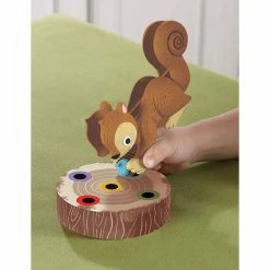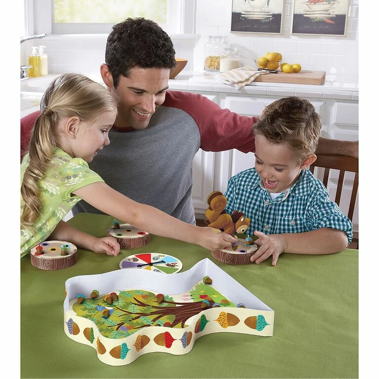 Your forest friends are hungry and they need your help! This award-winning preschool game develops matching and sorting skills, strategic thinking, hand-eye coordination, fine motor skills, and pre-handwriting skills. Includes 1 set of Squirrel Squeezers, 20 colored acorns, 4 logs, 1 game spinner, and game board (doubles as game box!) SMALL PARTS [1]. Not for