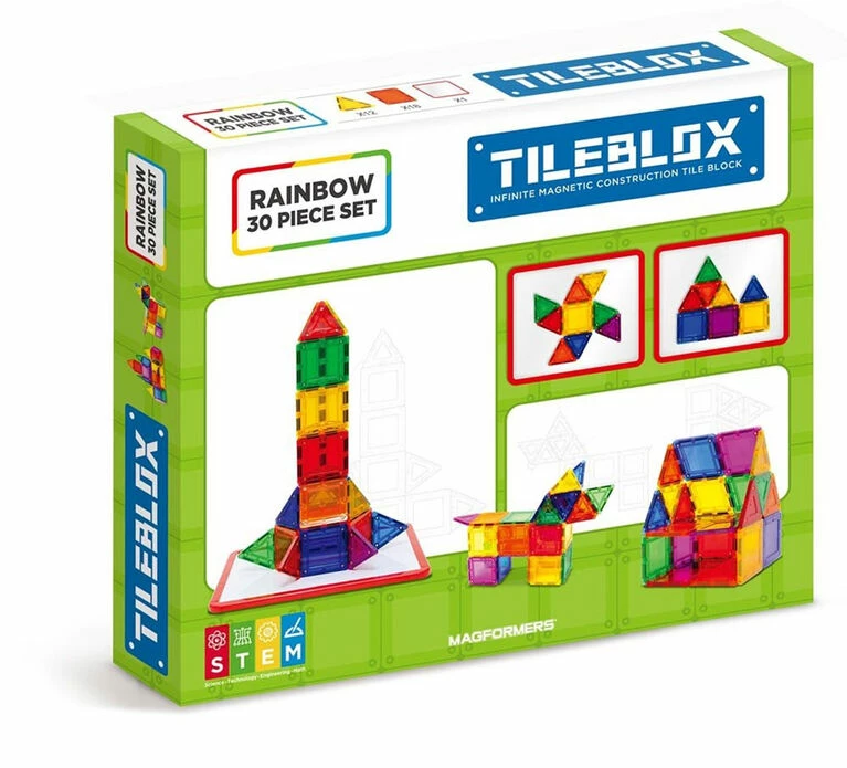 Create your own designs with the Tileblox Rainbow 30-piece Set! With squares and triangles in 6 different colors, you can let your creativity run wild! Build unique designs on the included magnetic board and take your creations with you as you travel. Follow along with the idea sheet and learn as you build!