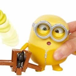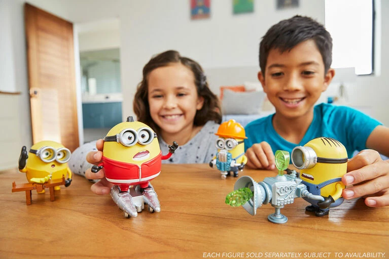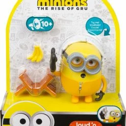 The beloved Minions are back and as mischievous as ever. Recreate Minions: the Rise of Gru fun with key character figures that really come to life! Each says 10+ expressions, has iconic accessories and performs an unforgettable moment from the movie. When you engage their action, they laugh and they yell. Loud ‘n Rowdy Bob trains for big Kung Fu fight scenes by chopping through a bench with a loud “Hi-ya!” He also comes with his favorite food a bunch of bananas. Watch them fly when he chops hard through his board. If he hits it too hard, the board gets stuck on his hand for extra laughs. Get louder and rowdier with other Minions like Construction Dave who wriggles, giggles and jiggles as he jackhammers, Stuart who shoots fart and boot projectiles and new character Otto who races across the ground on rocket skates. Each approximate 4-inch scale Minion has universal handgrips and most have removable accessories to swap and share. All are compatible with our Action Minions, Movie Moments Minions and our Wild Rider RC vehicle to keep your movie fun coming. Each figure sold separately, subject to availability. Colors, decorations and dimensions may vary.