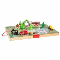 Built-in tracks, colorful scenery, and fun play pieces let kids take their imaginations for a spin … and take playtime anywhere they want to go! Unfold the sturdy wooden case to create an illustrated play surface with built-in train and road tracks for the three wooden wheeled trains and a park ranger vehicle. Set up a bridge and a mountain tunnel with a gondola that slides across the top! Wooden play pieces include buildings, animals, trees, and a railroad crossing sign to enhance imaginative storytelling. All the pieces store in the fold-up case with convenient carrying handle for easy cleanup and travel (there’s plenty of room to add other toys, too!). Keep playtime rolling for kids three and older and encourage independent play and motor skill development.