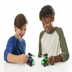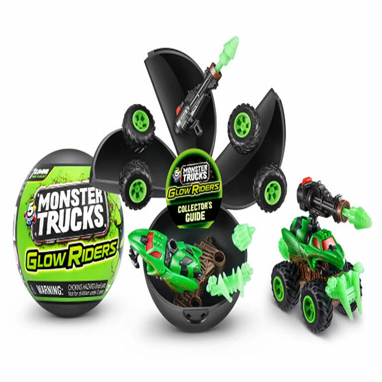 Unbox, build, battle, and race with 5 Surprise Monster Trucks Glow Riders! These 5 Surprise capsules come packed with extreme monster truck parts that will have you revving to go! Unbox to discover glow in the dark bumpers and fireable weapons plus wheels, chassis and tricked out truck bodies. Build your monster truck and use your firing weapon to shoot and destroy the competition from up to 4f t/ 1.2m away! There are 7 epic Glow Rider Monster Trucks to collect, made for those with a need for speed. Every truck part is interchangeable so you can collect, create, and construct your ultimate Glow Rider Monster Truck. Watch out for the super rare Jawz truck for the ultimate battle and race. Which will you unbox?