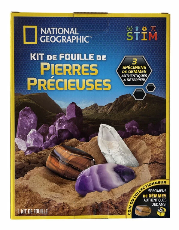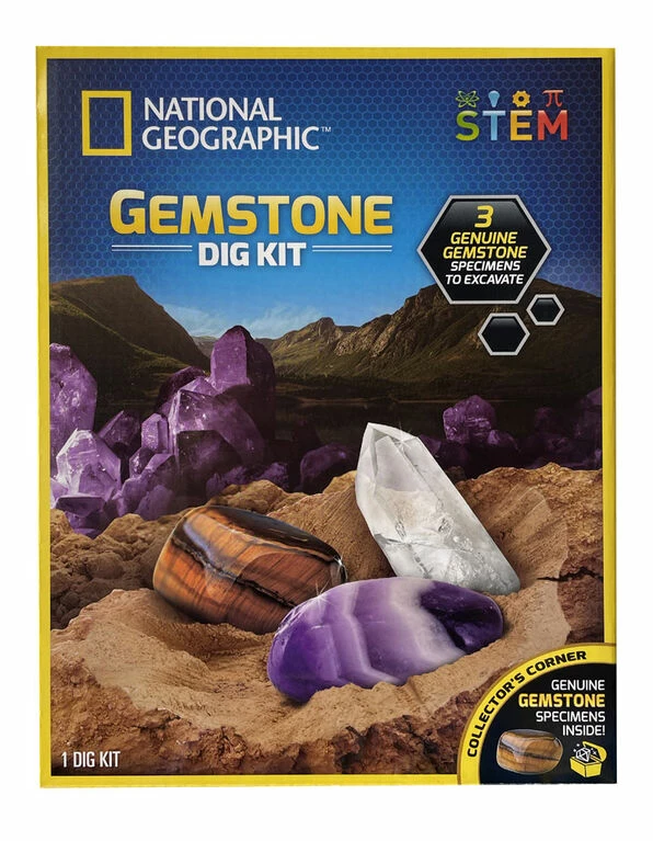 Experience the thrill of discovery with the National Geographic Gemstone Dig Kit! You’ll excavate tiger’s eye, amethyst, and quartz from the dig brick with the included dig tools, just like a real geologist. A full-color learning guide provides fascinating insight into your new specimens, and a magnifying glass allows you to get a closer look at each. This hands-on science kit is an exciting way to explore the awesome world of geology right at home!