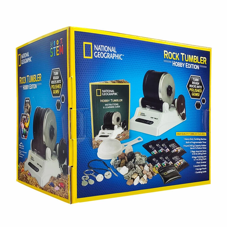 Learn about the exciting hobby of rock tumbling with National Geographic. This set includes all the accessories you’ll need to start polishing dazzling gems. Rock tumbling is tons of fun and a great way to start an extraordinary rock collection. Kids can use the included jewelry fastening to create beautiful homemade jewelry! This expansive set contains a heavy-duty tumbling machine and rubber tumbler barrel. A programmable timer ensures you get the perfect tumble time!