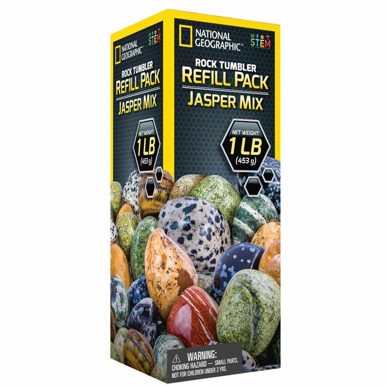 National Geographic’s Rock Tumbler Refill Pack featuring Jasper mix! Turn rough rocks into polished gems! This rock tumbler refill kit contains eight different types of semi-precious jasper stones from around the world! Rock tumbler not included.