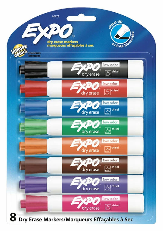 Bright, vivid, non-toxic ink is quick-drying, smear-proof, easy to see from a distance, and provides consistent color quality. Whiteboard markers with versatile chisel tips allow for broad or fine writing. Erases cleanly and easily with a dry cloth or Expo eraser. Ink is specially formulated to be low-odor. Perfect for use in classrooms, small offices, and homes.