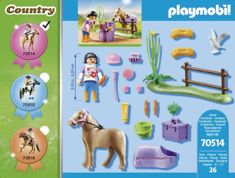 Explore fun riding adventures with the Collectible Icelandic Pony. The little girl and her beloved Icelandic pony are inseparable. Every day the horse lover takes care of her pony, give it fresh hay, grooms it’s coat and looks after its hooves. When finished caring for the pony, store the grooming tools in the purple chest. Then, cover the pony with the purple blanket to keep it warm. Play with this set on its own or combine it with the rest of the PLAYMOBIL Pony Farm world (#70510-70516, 70682-70683, 70518-70523 – each sold separately) for even more fun. Set includes one child figure, Icelandic pony, bucket, hay, carrots, tool chest, fencing, dove, greenery, and many other accessories. Recommended for ages four to ten years.