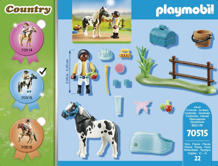 Explore fun riding adventures with the Collectible Lewitzer Pony. The young rider and pony are a great pair. The horse loves to snack on the apples while getting groomed each day by the caretaker. Once the grooming is finished, store the tools in the blue chest and cover the pony with the blanket to keep it warm. Play with this set on its own or combine it with the rest of the PLAYMOBIL Pony Farm world (#70510-70516, 70682-70683, 70518-70523 – each sold separately) for even more fun. Playset includes one figure, Lewitzer pony, bucket, hay, apples, tool chest, blanket, fencing, many other accessories. Recommended for ages four to ten years.