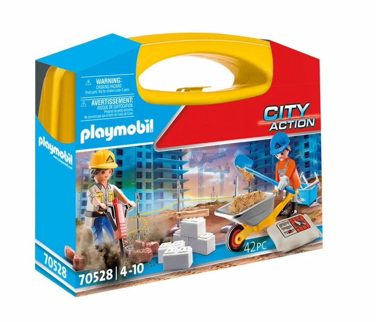 The workers have arrived and are ready to build with the Construction Site Carry Case. This take-along case gives you the tools for the job, including a wheel barrow for easily transporting the bricks and stones to the building site. Both workers wear their helmets for safety as they secure the job site with the posts and rope. When playtime is over, pack all the pieces inside the case for easy storage and travel fun. Playset includes two construction workers, wheel barrow, jack hammer, building materials, tools and safety helmets. Recommended for ages four to ten years.