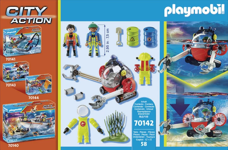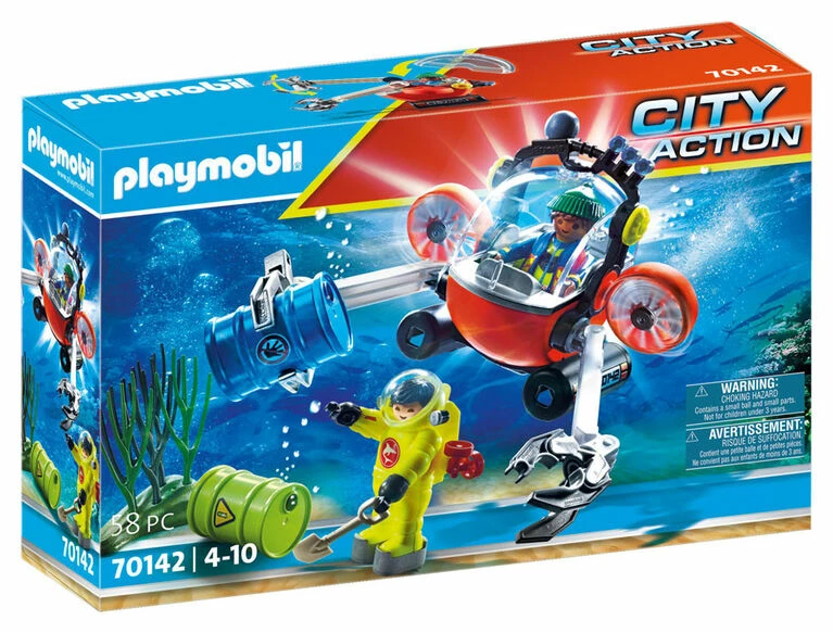 Join the divers on an Environmental Expedition in the Dive Boat and help as they search the ocean floor for suspicious materials. Use the gripper arms to carefully pick up the hazardous barrels and transport them safely to the surface. Combine this set with the rest of the PLAYMOBIL Sea Rescue theme (#70140- 70145 – sold separately) for even more adventures! Set includes two figures, diving robot with gripper arms, diving suit, two barrels, a shovel, and other accessories. Recommended for ages four to ten years.