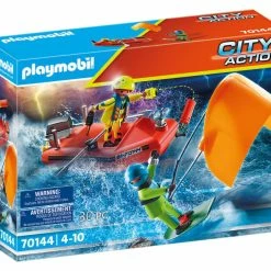 Time for an daring Kitesurfer Rescue with Speedboat. The rescue boat quickly reaches the kitesurfer and deploys rescue equipment to lift him safely into the boat. Boat floats and is compatible with the underwater motor (7350 – sold separately). Combine this set with the rest of the PLAYMOBIL Sea Rescue theme (#70140- 70145 – sold separately) for even more adventures! Set includes two figures, speedboat, wakeboard, and other accessories. Recommended for ages four to ten years.