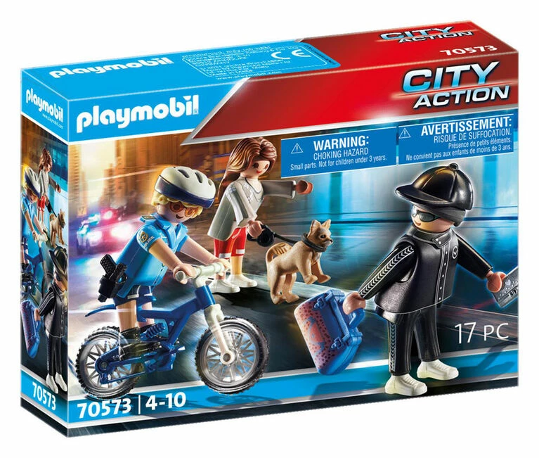 In pursuit of the stolen purse is Police Bicycle with Thief! Oh no, a woman has been robbed while walking her dog. The police bicycle quickly chases after the suspect to reclaim the stolen items. Set includes one police figure, robber, female figure, bicycle, dog with leash, and other accessories. Recommended for ages four to ten years.
