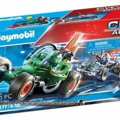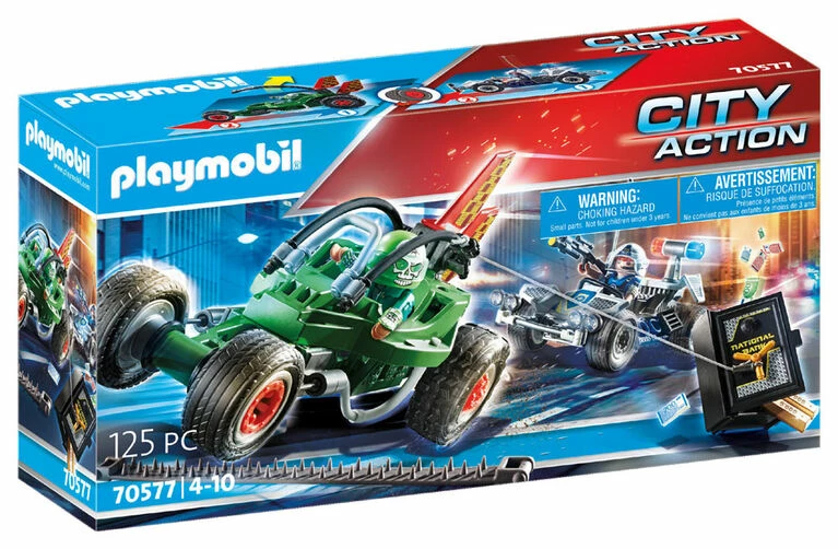 Time for an exciting car chase with the Police Go-Kart Escape! Both vehicles are equipped with a pullback motor to bring the action to life. Set includes two figures, police quad, go-kart, safe with money and gold bars, road spikes, and other accessories. Recommended for ages four to ten years.