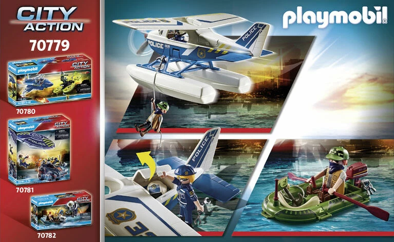 Patrolling from the skies sometimes means spotting criminal activity at sea too! Luckily, the Police Seaplane can land on water close to the scene. The cockpit can accommodate two figures and has a storage compartment for equipment behind the wings. When ready to take flight, manually spin the propellers and lift off. Up in the sky, seaplane pilots can monitor for miles around. When thief is spotted in a small getaway boat, the aircraft lands to investigate and takes the suspect in for questioning. Set includes two figures, seaplane, small motorboat, handcuffs, helmet with microphone, and other accessories. Seaplane Dimensions: 12.0 x 11.8 x 5.9 in (LxWxH). Boat Dimensions: 5.5 x 2.6 x 1.6 in (LxWxH). Recommended for ages five to ten years.