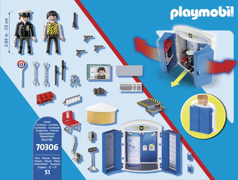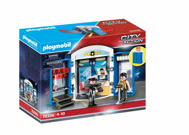 Protect the city with the Police Station Play Box. To begin playing, simply open the two front panels to fight crime. Once the thief is brought to the station, his photo is taken and stored on the computer. Perfect for on-the-go play, all the pieces can be stored inside this portable set and the top can be used as a handle, making it a must-have travel accessory. Set includes two figures, counter, chair, camera, and many other accessories. Dimensions Closed: 5.1 x 3.1 x 6.3 in (LxWxH). Dimensions Built: 9.8 x 2.6 x 6.3 in (LxWxH). Recommended for ages four years and up.