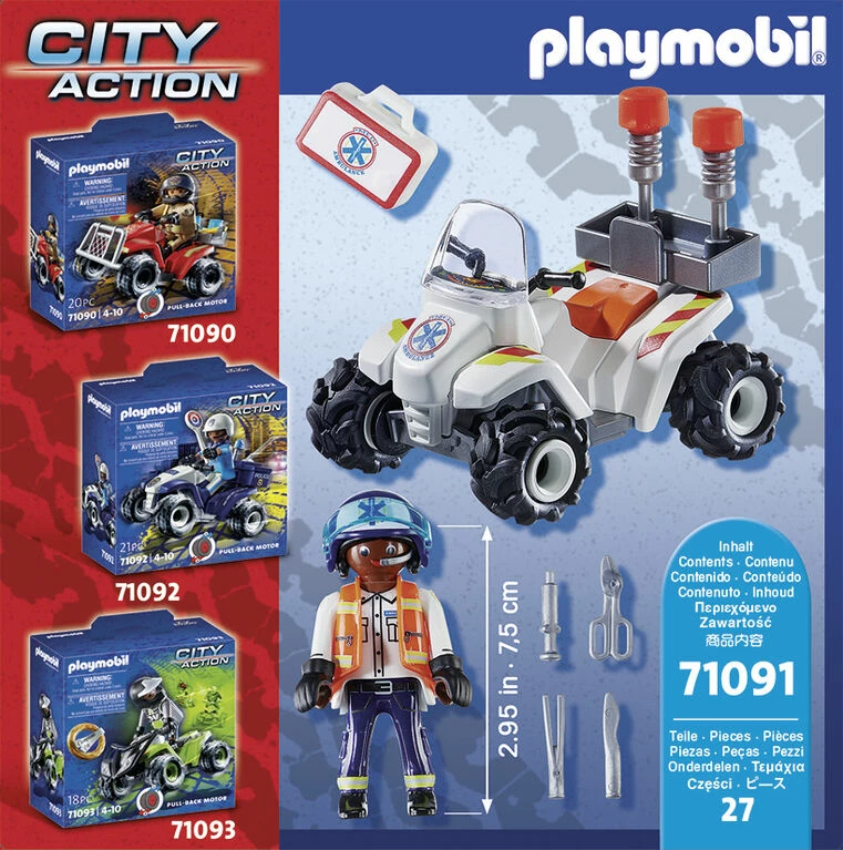 The emergency call has just come in and the doctor jumps onto the Medical Quad and heads to the scene. Thanks to the quad’s pull-back motor, the doctor arrives in no time and is ready to help treat the injured. The back storage rack securely holds the medical kit so that he has everything he needs. Set includes a PLAYMOBIL doctor, quad with pull-back motor, doctor’s kit with medical tools, helmet and gloves. Recommended for ages four to ten years.