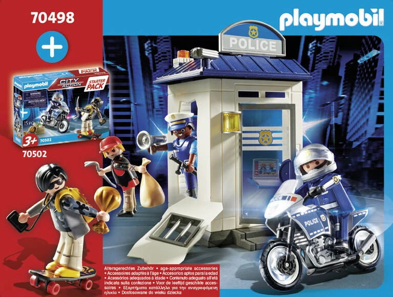 Starter Packs – the perfect introduction to PLAYMOBIL theme worlds! The brave policeman has caught the thief and brings him to the Police Station. But suddenly, the criminal escapes through the hole in the wall, and the chase starts all over again! Set includes two figures, station building, crowbar, and other accessories. Combine this set with the PLAYMOBIL Starter Pack Police Chase (#70502 – sold separately) for even more police action. Building Dimensions: 4.1 x 4.7 x 7.3 in (LxWxH). Recommended for ages three years and up.
