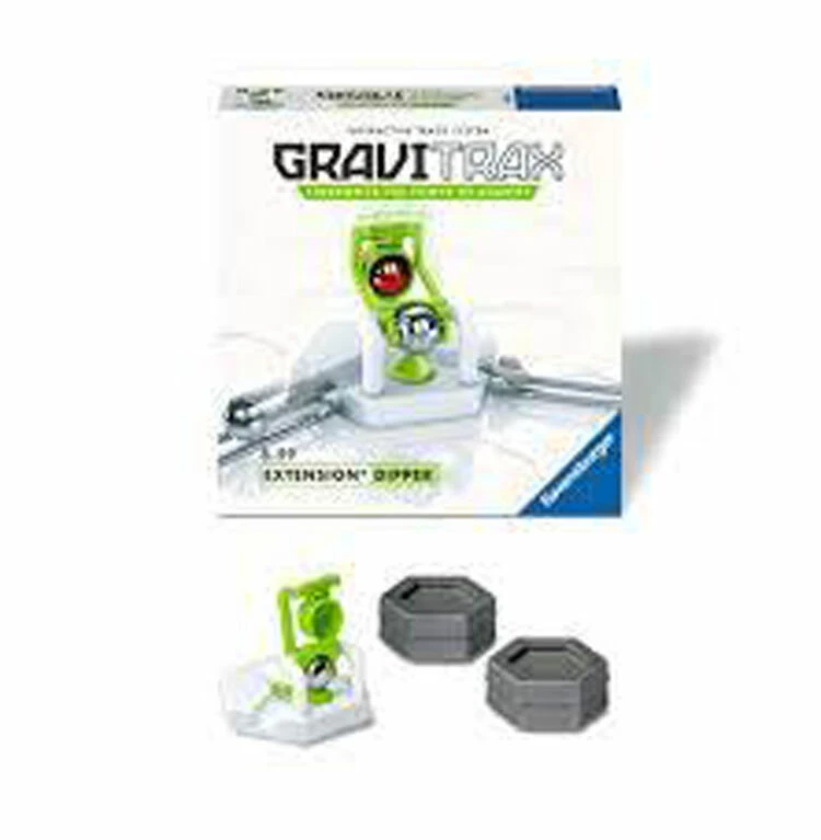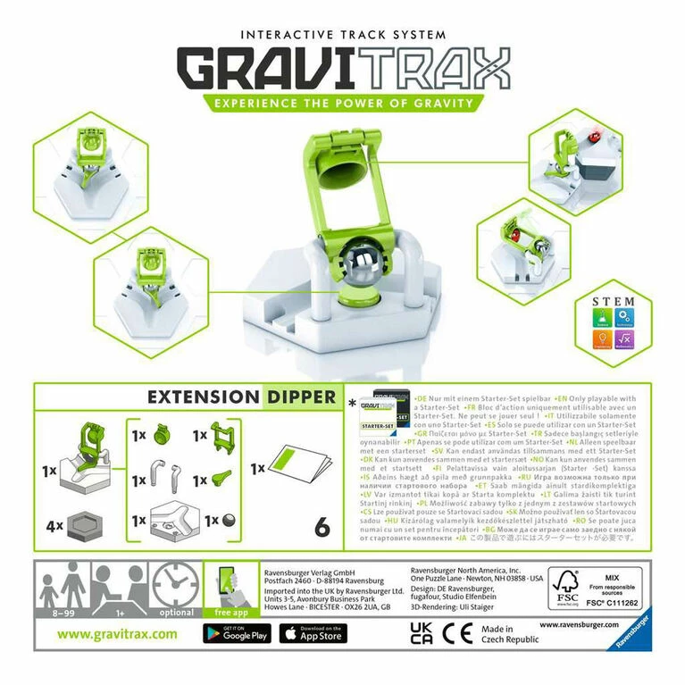 R Exclusive, only available at Toys R Us Canada. Dip down between levels! The Dipper will take your marble, pick it up, move down a level and drop it. Use this extension for a dynamic way to change between the levels in your tracks. You can control what side the ball will leave the Dipper allowing you to continue building in the right direction. Combined with the GraviTrax Starter Set, the Dipper will guarantee fast-paced fun and action-packed tracks! This STEM system [Science, Technology, Engineering and Maths] is an ideal one to teach kids about gravity, magnetism, kinetic energy and fun. Hit a snag? Freestyle with your own track design or use the tasks and blueprints included to help you to get started in the world of GraviTrax! Are the gravity spheres stopping or flying off before reaching the end target? Time for some problem solving. Rebuild and try something different! The GraviTrax track system can be extended indefinitely with extra track packs and add-on’s – each sold separately. This set is suitable for 1+ players, ages 8 years and up. 1x Dipper, 4x Height tiles and Instructions