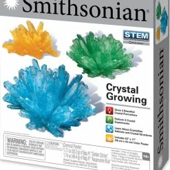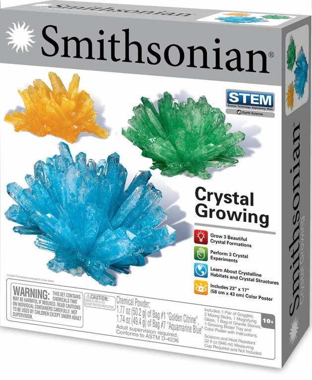 Grow your own collection of crystals with the “Golden Citrine” and ‘Aquamarine Blue” sparkling colors. Learn about crystalline habitats and crystal structures. Includes ; one pair of goggles, two mixing sticks, one magnifying glass, one measuring cup, one bag of granite stones, one growing blister tray, color poster, instructions and chemical powder
