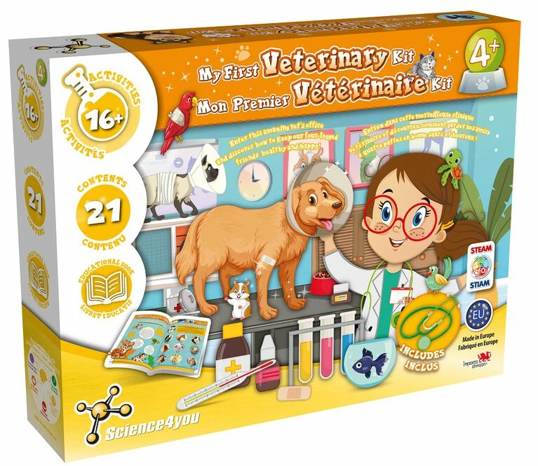 Enter this office, learn what the day-to-day tasks of a veterinarian are and discover how important this profession is to help animals! With lots of fun and imagination they will be able to analyze an x-ray and learn to apply a bandage! With this kit children will be able to learn which pets and key concepts such as their anatomy, nutrition, behavior and even genetics!